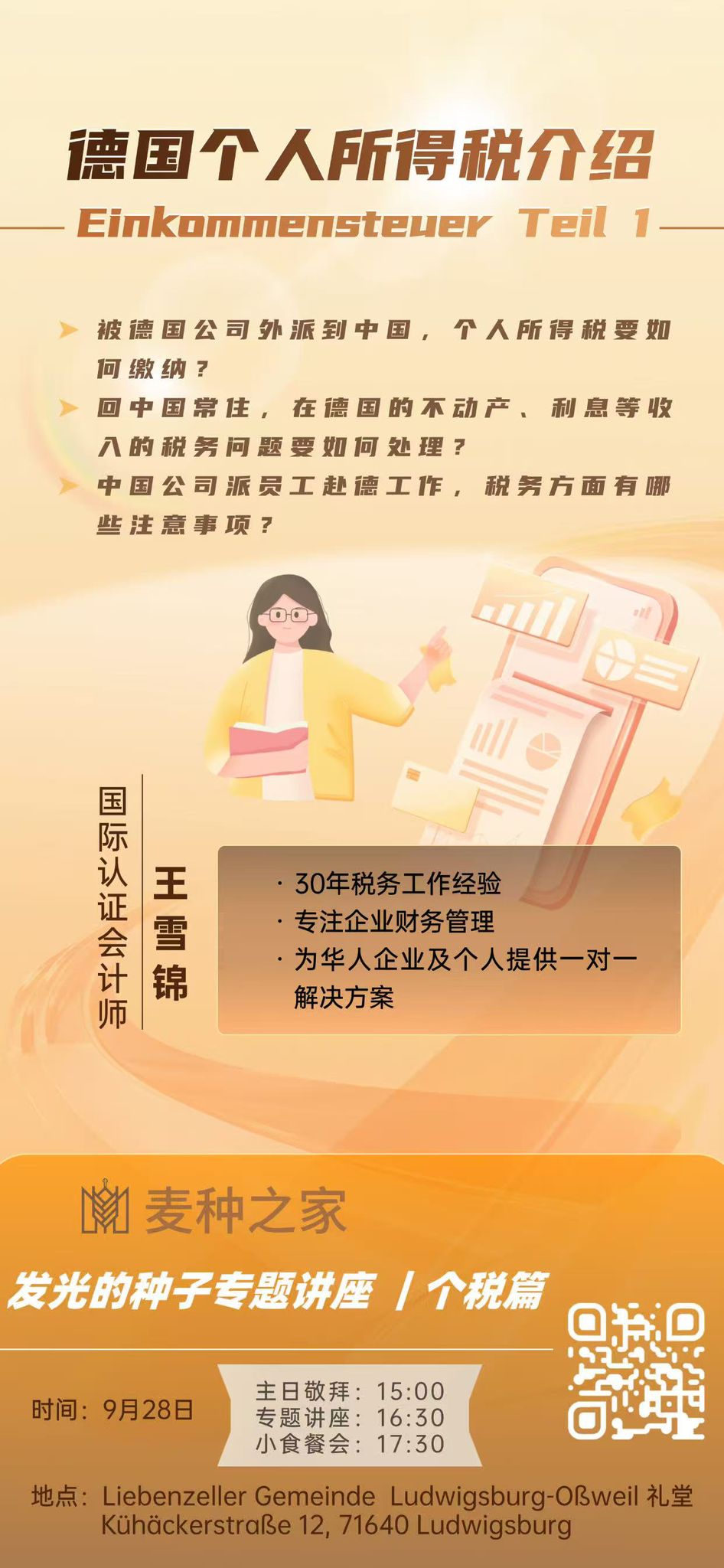 2025年9月28日下午主日崇拜后,我们将举办麦种之家“发光的种子”专题讲座 —— 个税篇。讲座结束后有小食餐会,欢迎大家届时参加!