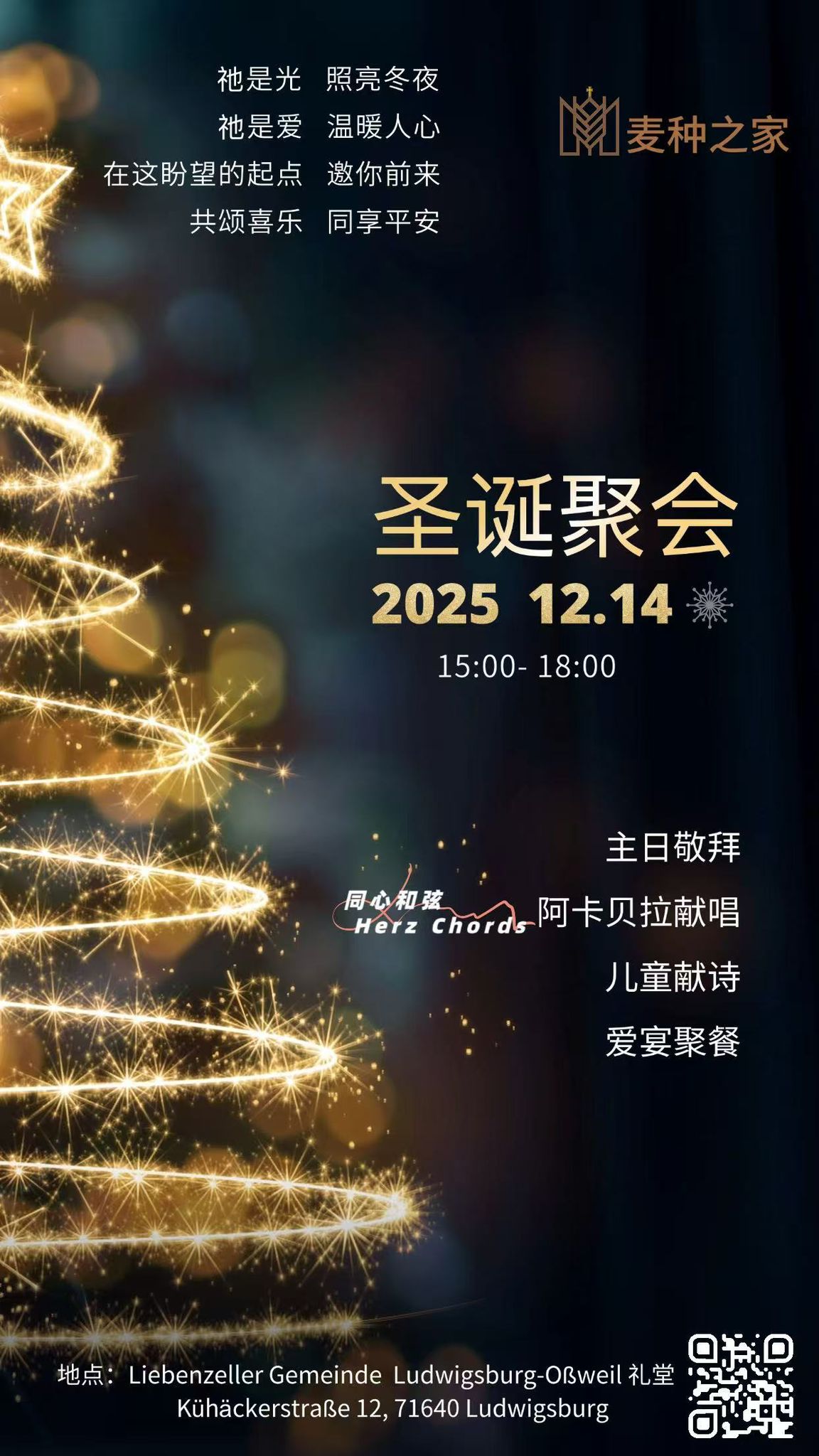 2025年12月14日下午我们将举办麦种之家圣诞特别敬拜。敬拜结束后有爱宴,欢迎大家届时参加!